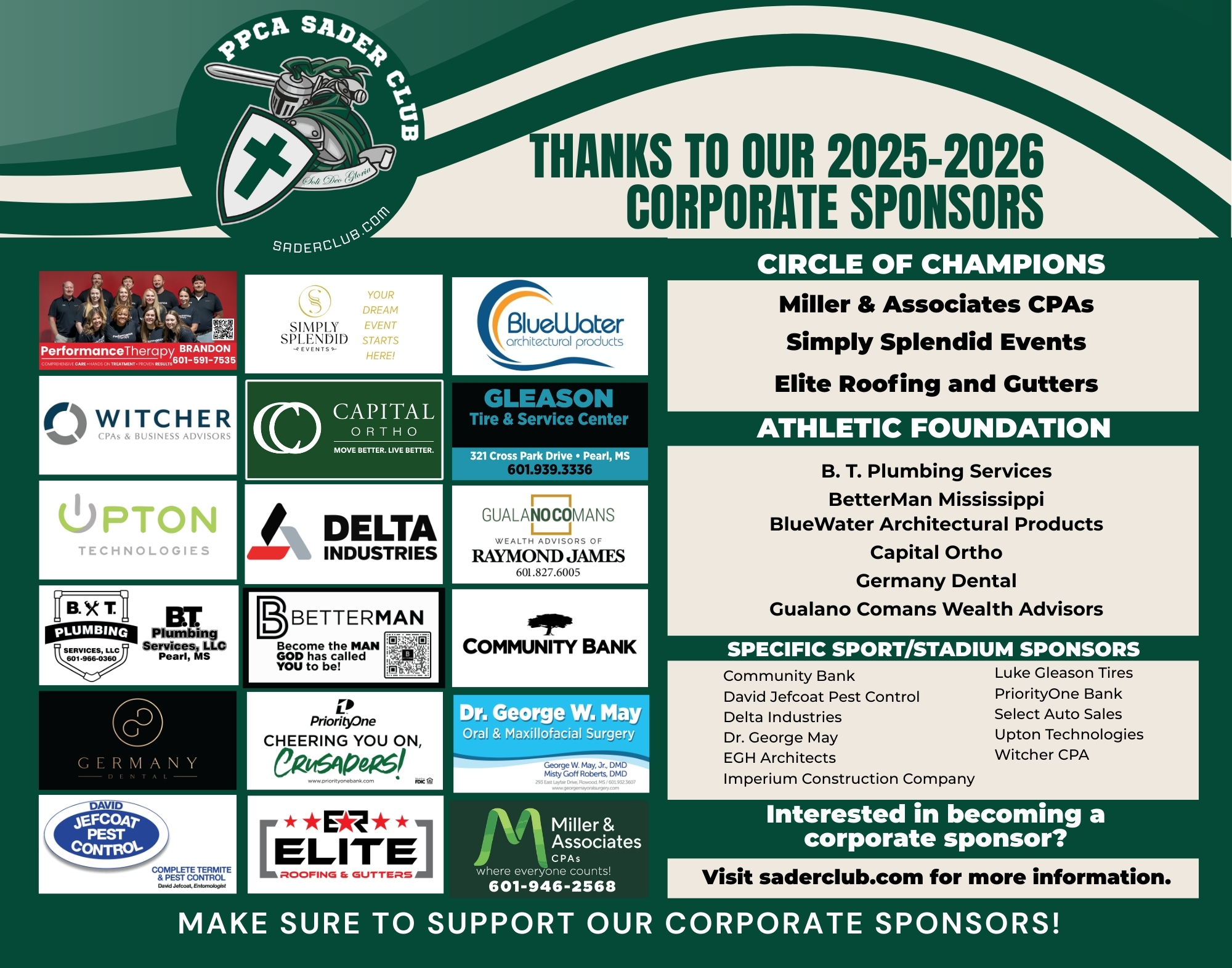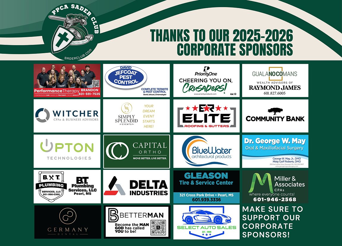 We are incredibly grateful for our 2025–2026 Corporate Season Sponsors! Your generous support makes a lasting impact on our student-athletes by providing them with opportunities to grow not only in their athletic abilities, but also in character, teamwork, and leadership. At PPCA, we believe sports are an extension of our mission to build excellence in every area of life, and your partnership helps make that possible. Thank you for investing in our students, believing in their potential, and standing alongside us as we encourage the next generation to honor Christ both on and off the field.